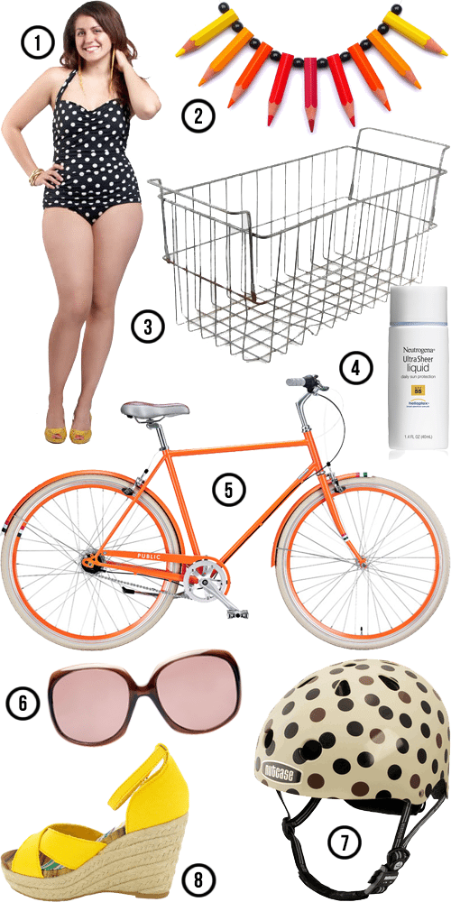 1. Beach Blanket Bingo One-Piece . Modcloth   2. Pencilmania Necklace . Aroha Jewelz 3. Vintage Wire Basket . Bridgewood Place   4. Ultra Sheer Liquid SPF 55 . Neutrogena 5. PUBLIC D8 Bicycle . Public   6…. link decorationRead More